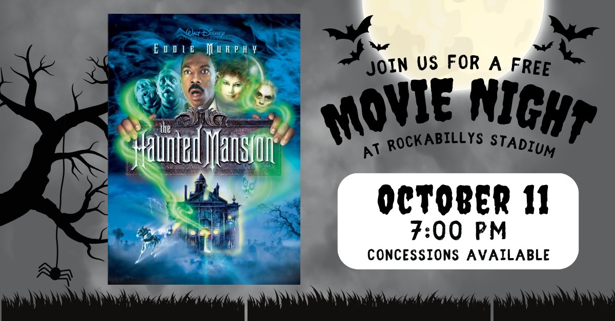Join us on Saturday, October 11th for a FREE movie under the stars! We’ll be showing Haunted Mansion — the perfect spooky kickoff to the fall season! Rockabillys Stadium Gates open at 6:00 PM | Movie starts at 7:00 PM Admission is FREE – bring your friends, family, and blankets! |